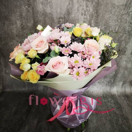 Этот прекрасное сочетание кустовых цветов, заставит улыбаться каждую девушку на планете! А Вы знаете какая искренняя улыбка у вашего получателя?! Предлагаем вам посмотреть, подарив этот сияющей букет.